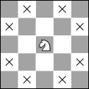 - Knight: The knight always moves by "jumping" two squares in one cardinal direction and one square in a direction perpendicular to the first. There are 8 possible squares that a knight can move to from a given position, and these are shown in the figure below.