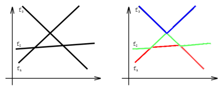 有n 个连续函数fi (x),其中1 ≤ i ≤ n。对于任何两个函数fi (x) 和fj (x),(i != j),恰好存在一个x 使得fi (x) = fj (x),并且存在无穷多的x 使得fi (x) < fj (x)。对于任何i; j; k,满足1 ≤ i < j < k ≤ n,则不存在x 使得fi (x) = fj (x) = fk (x)。