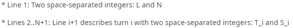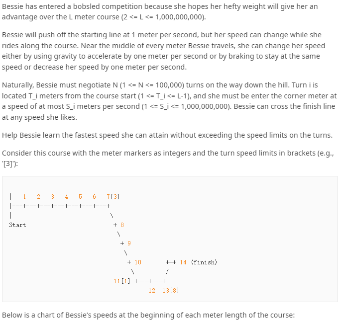 贝茜从山顶滑雪到山脚,山顶到山脚距离是L(2<L<10^9)米.贝茜在起点的速度是1米每 秒,但是他的速度是可以改变的,在每一米的速度可以是前一米的速度加1、减1,或者等于前一米 的速度.在滑行的过程中,贝茜会遇到N<=100000)个转弯处,第i个转弯处位于距离出发 Ti米处,为了安全,贝茜到达第i个转弯处的速度不能超过Si(1<Si<10^9)米 每秒.当然贝茜到达终点时的速度没有最大限制.请你计算贝茜在滑雪过程中最大的速度可以是多 少?