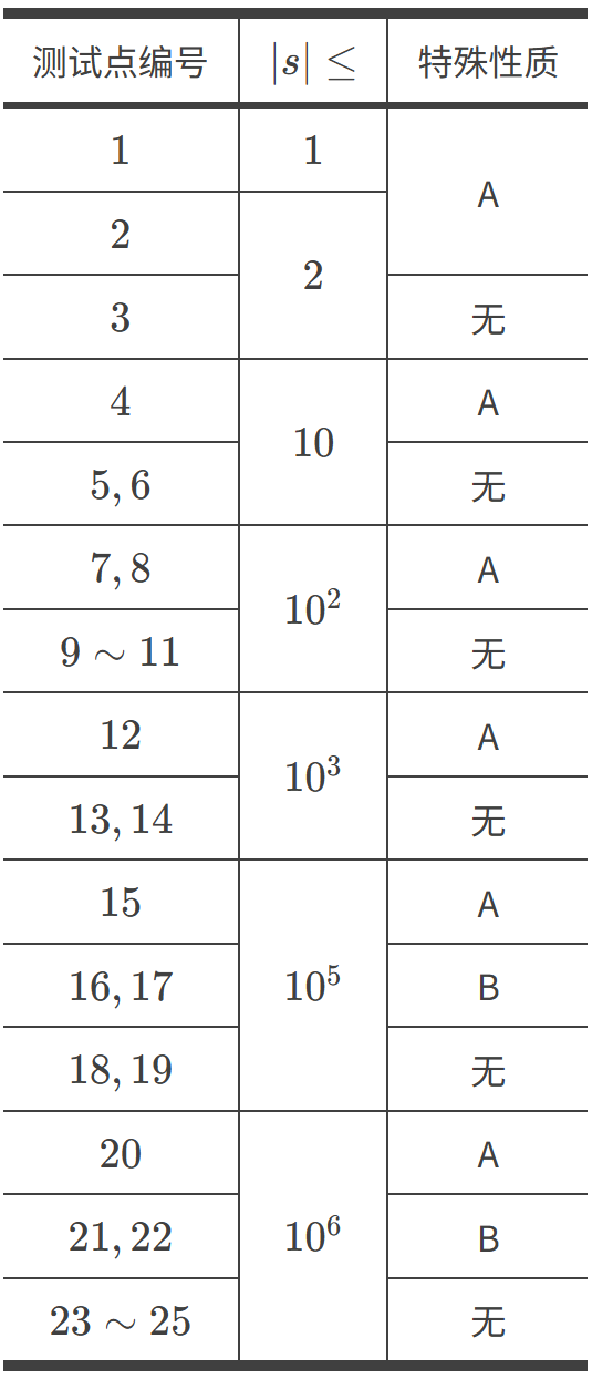 设 $|s|$ 为字符串 $s$ 的长度。对于所有测试数据,保证: