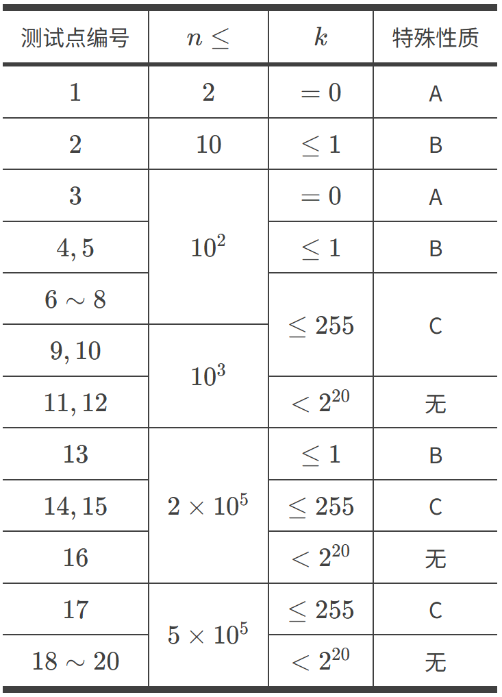- $1 \leq n \leq 5 \times 10^5$, $0 \leq k < 2^{20}$;