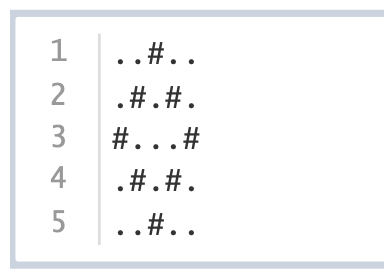 小 A 想绘制一个菱形。具体来说,需要绘制的菱形是一个n行n列的字符画,n是一个大于1的奇数。菱形的四个顶点依次位于第1行、第1列、第n行、第n列的正中间,使用 # 绘制。相邻顶点之间也用 # 连接。其余位置都 是 . 。例如,一个5行5列的菱形字符画是这样的: