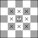 - King: The king can move in any of the eight cardinal and diagonal directions but by one square only. Put another way, the king can only move into the eight immediately adjacent squares. As such, this makes the king one of the weakest pieces on the board.