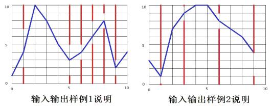 接下来的n行,每行2个用一个空格隔开的整数X和Y,依次表示在横坐标位置0~n-1上玩家点击屏幕后,小鸟在下一位置上升的高度X,以及在这个位置上玩家不点击屏幕时,小鸟在下一位置下降的高度Y。