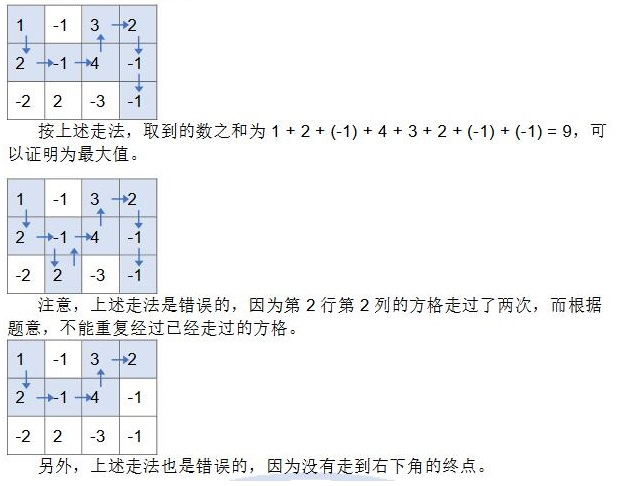 设有 n×m 的方格图,每个方格中都有一个整数。现有一只小熊,想从图的左上角走到右下角,每一步只能向上、向下或向右走一格,并且不能重复经过已经走过的方格,也不能走出边界。小熊会取走所有经过的方格中的整数,求它能取到的整数之和的最大值。