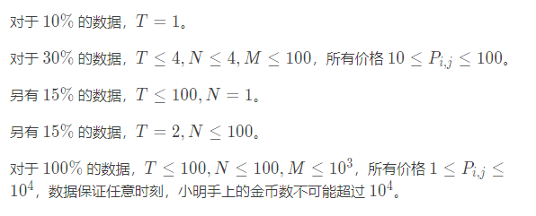 小伟突然获得一种超能力,他知道未来 TT天 N种纪念品每天的价格。某个纪念品的价格是指购买一个该纪念品所需的金币数量,以及卖出一个该纪念品换回的金币数量。