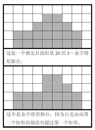 为了使晚会更加吸引人,平平觉得舞台应该是朝北的h—金字塔形。h—金字塔形舞台是由h个矩形舞台相接而成的,其中后方的矩形舞台的两端必须超出在其前面的矩形舞台,且最小矩形面对的朝向为舞台的方向。下面给出几个实例: