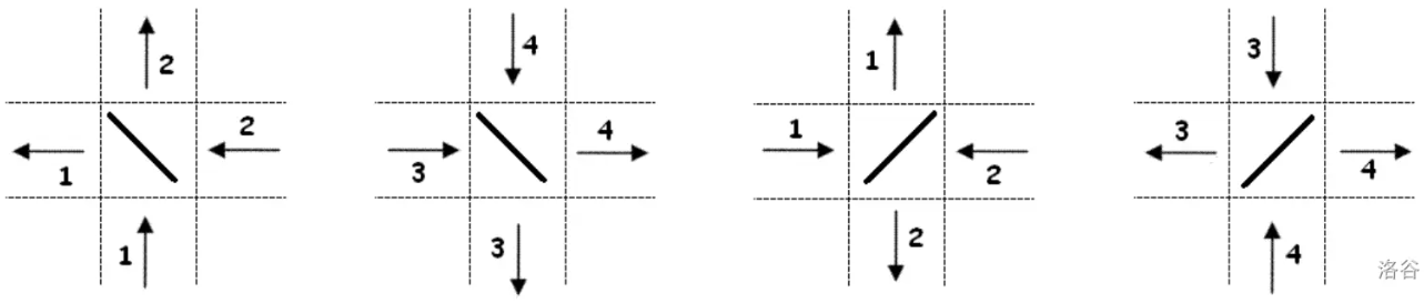 信号发射后,会沿当前行/列的直线方向传播,直到遇到行星,此时信号会被偏转 $90$ 度,转向另一个方向。有两种类型的行星,分别用 "/" 和 "\\" 表示。偏转规则如下图所示: