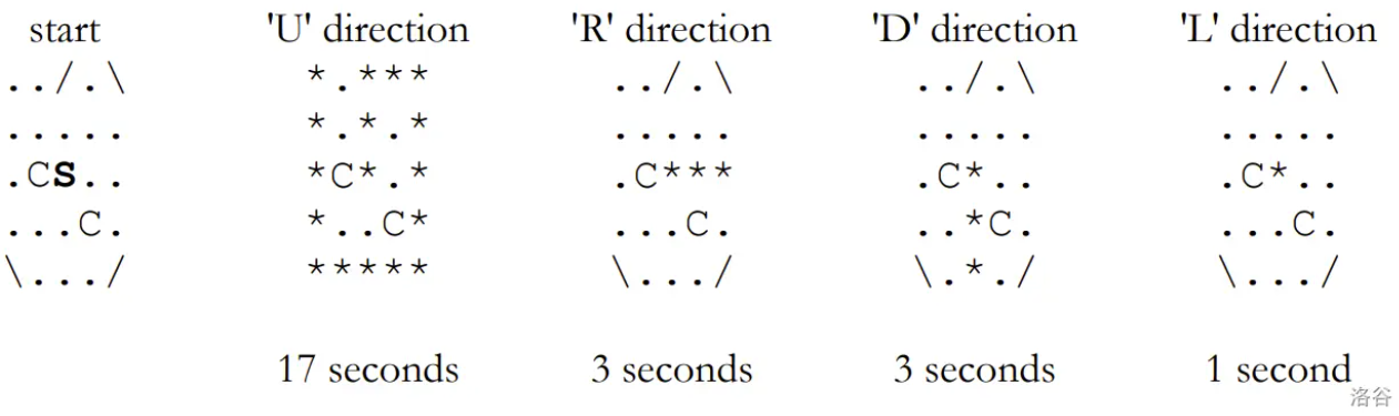 第一行输出最佳发射方向("U"、"R"、"D"、"L")。如果有多种方案,按以下优先顺序输出:先 "U",再 "R",然后 "D",最后 "L"。